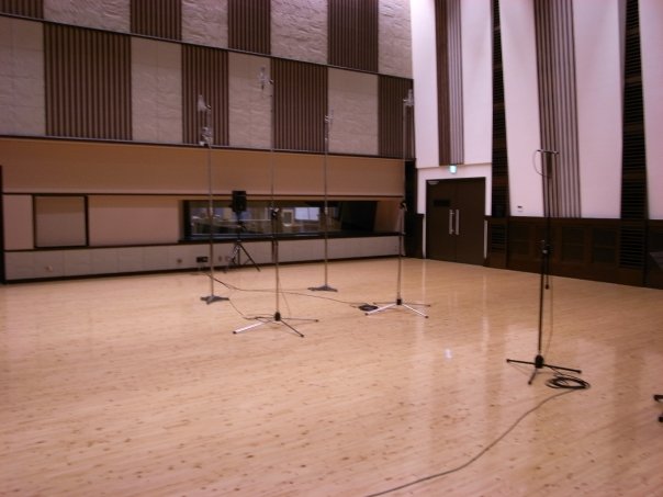 最初のサラウンド作品の録音が終わった後で 2012年12月19日 studiotutti 最初のサラウンド作品の録音が終わった後で 奥に見えるのは特殊なマイクセッティングの一つ hamasaki square